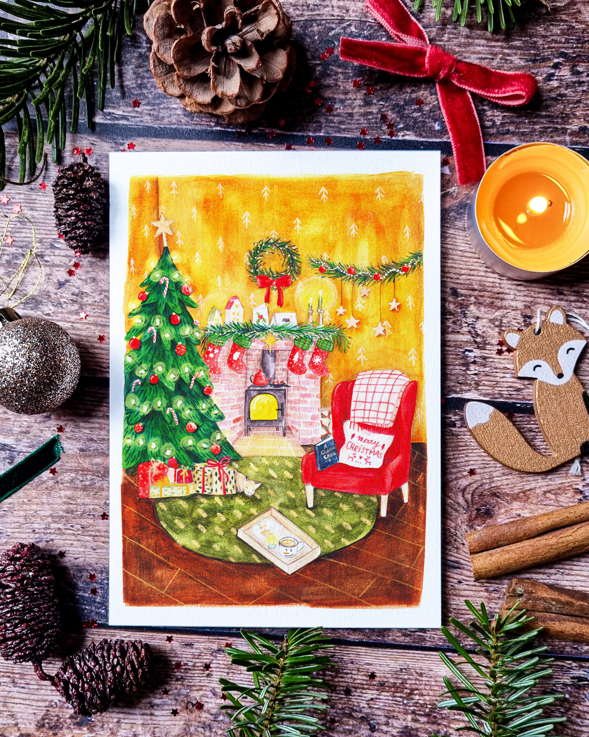 Une scène au coin du feu, avec un bon livre de saison, une boisson chaude, quelques biscuits de Noël, des châtaignes qui grillent sur le poil, la bouilloire qui fume, le sapin et ses jolies décorations et le chat qui ronronne à côté des cadeaux…