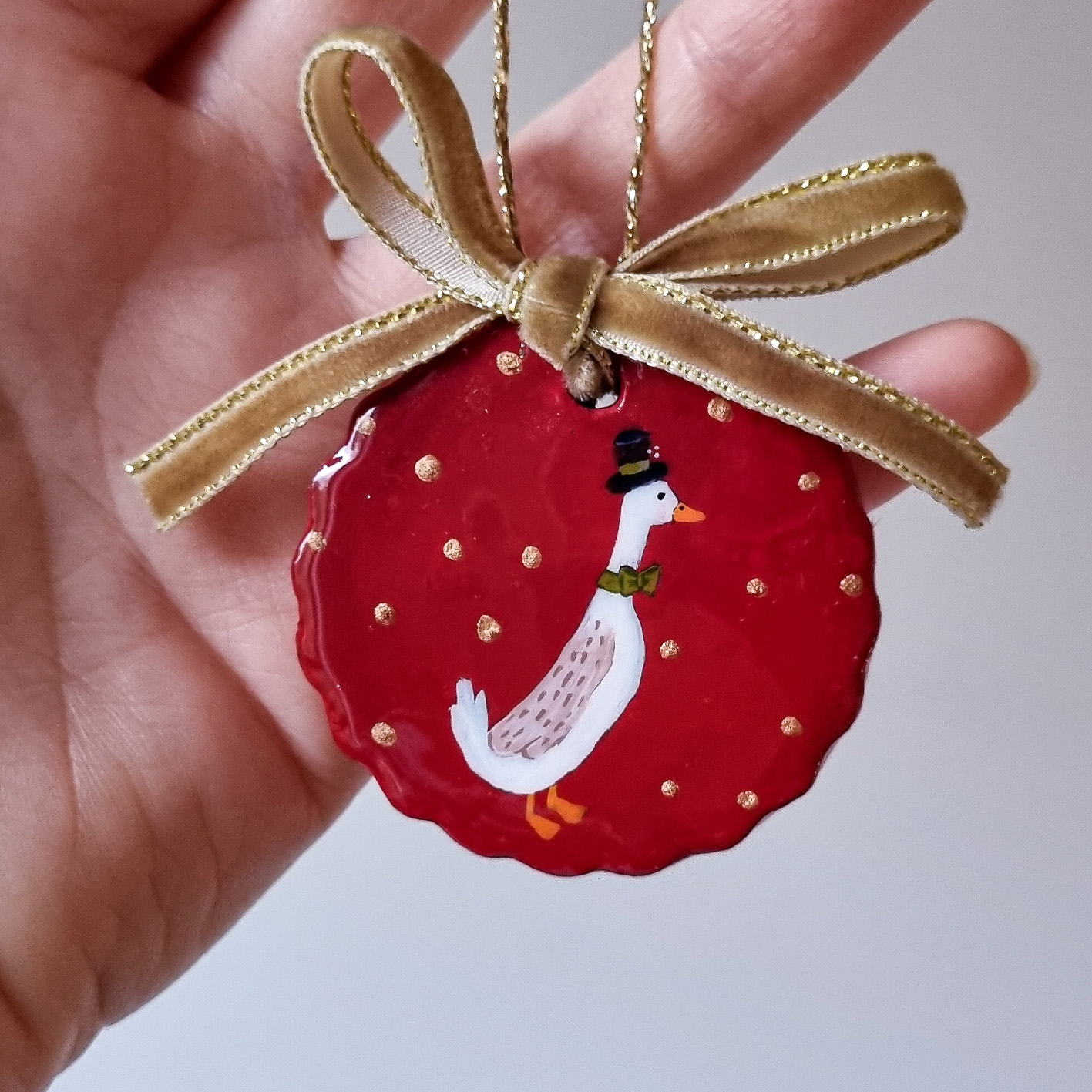 Monsieur running duck est prêt pour célébrer les fêtes de fin d’année avec son beau nœud vert et son chapeau haut-de-forme ! Il est peint sur fond rouge velours