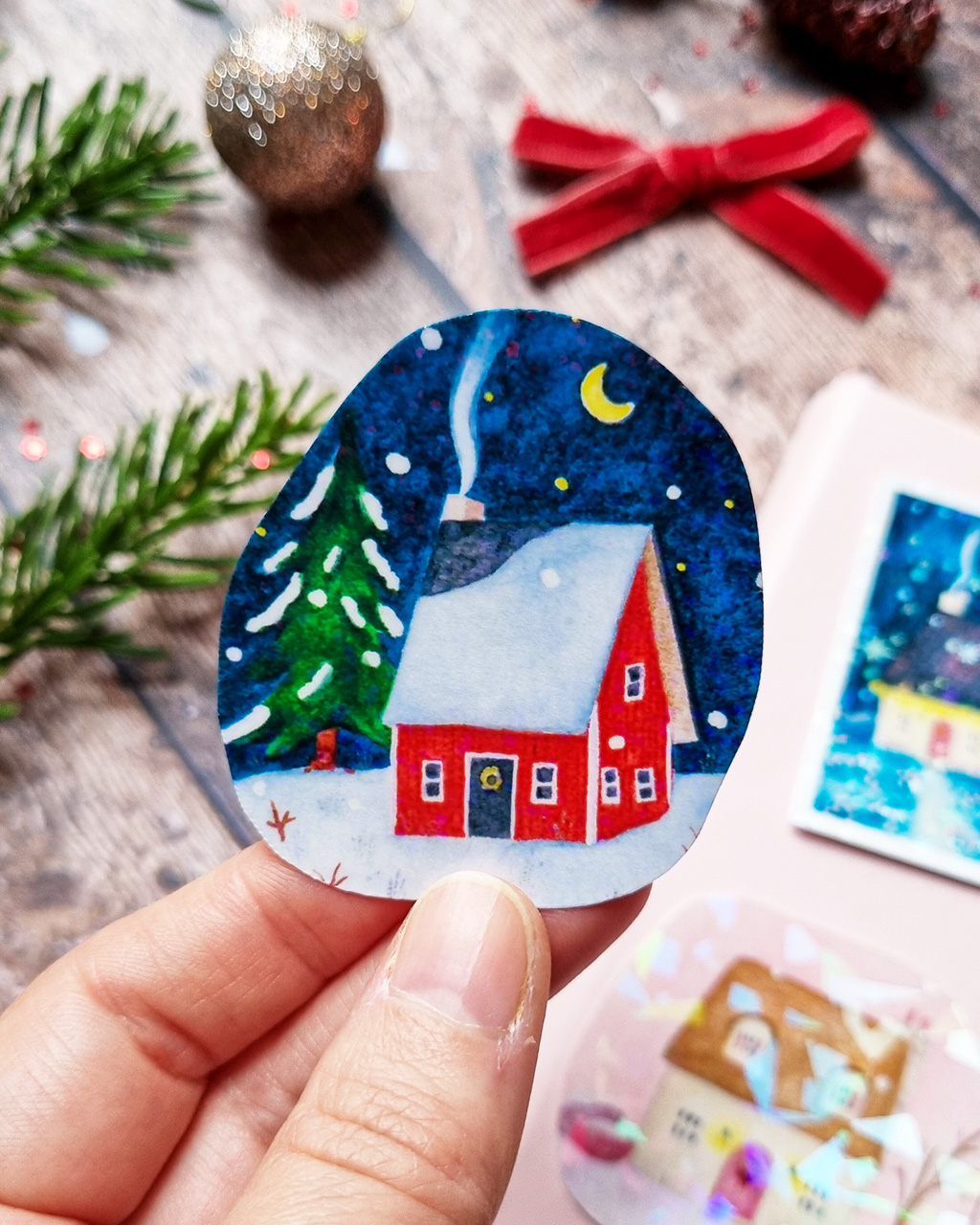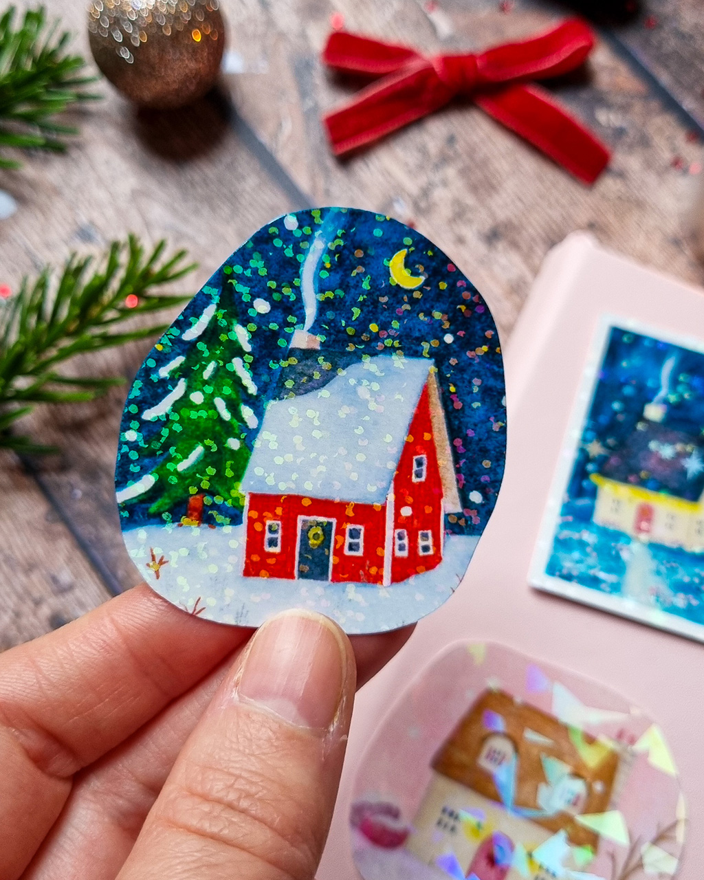 Un petit chalet rouge scandinave par une froide nuit d’hiver sous la neige qui tombe doucement pendant que ses habitants restent au chaud à l’intérieur. Les paillettes changent de couleurs selon l’éclairage, rappelant la lumière du soleil sur l’eau gelée en hiver.