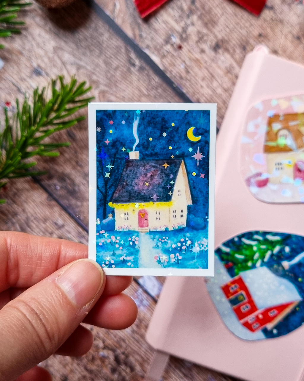 Une petite maison décorée pour les fêtes au milieu de son jardin givré à la lumière douce d’une nuit d’hiver. Les étoiles changent selon l’éclairage, apportant une touche de magie à ce décor.