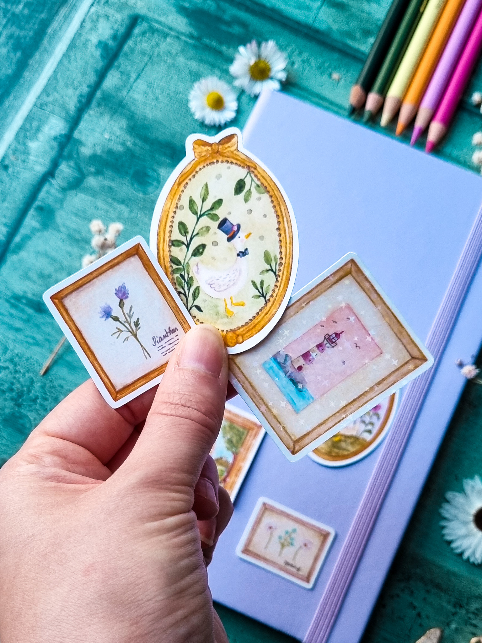 Un lot de stickers harmonieux composé du portrait de Monsieur l’Oie, d’un phare en bord de mer et d’un tableau de fleurs.
