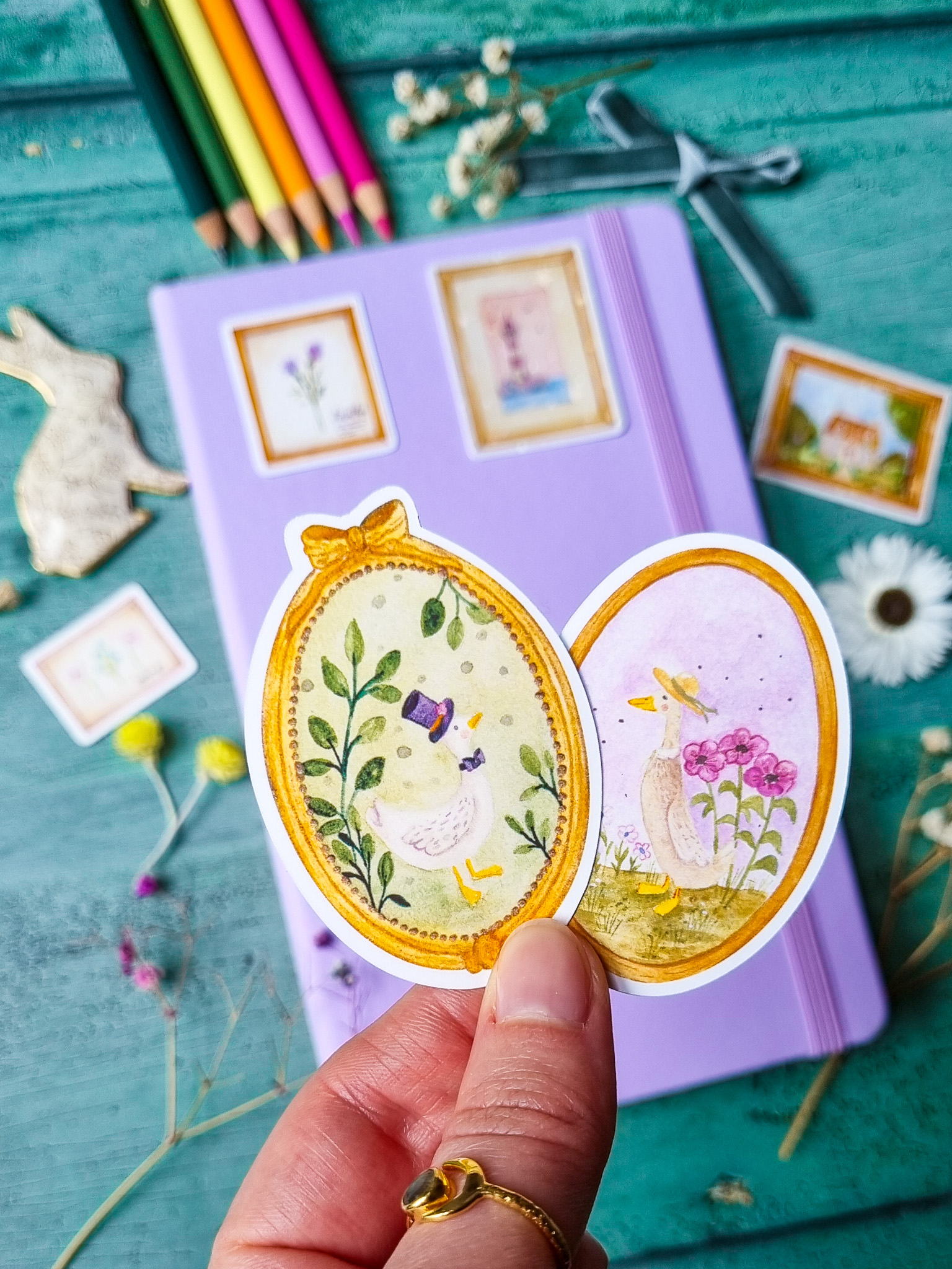 Un portrait au choix : un Monsieur l’Oie dandy qui pose au milieu des feuillages ou une Dame Running Duck qui se promène dans son jardin fleuri !