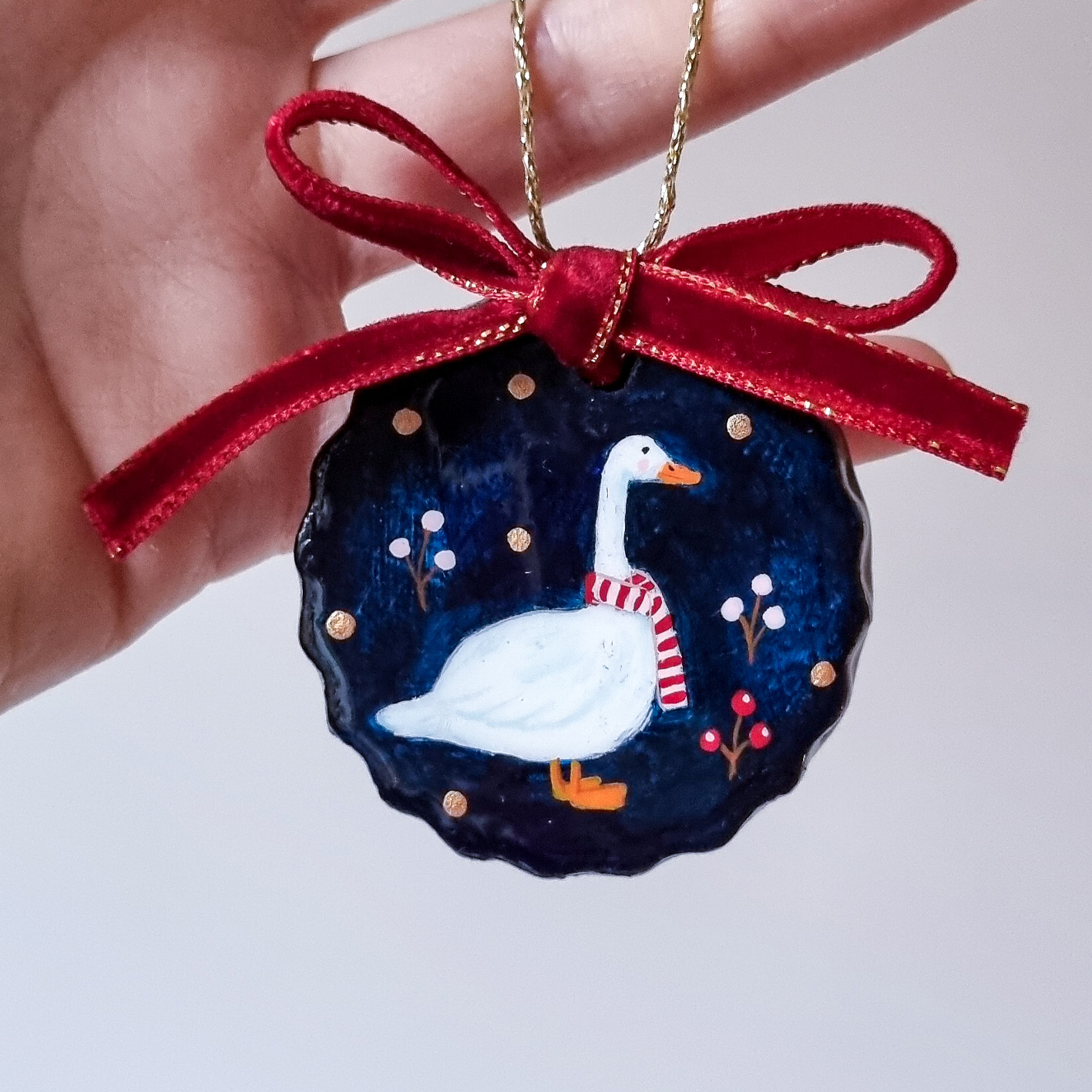 L’oie a sorti sa plus belle écharpe de Noël pour se rendre à la petite fête de Noël ! C’est la version soirée pull moche des animaux de la basse-cour. Elle est peinte sur un fond bleu nuit, décoré de petites baies roses et de pois dorés.