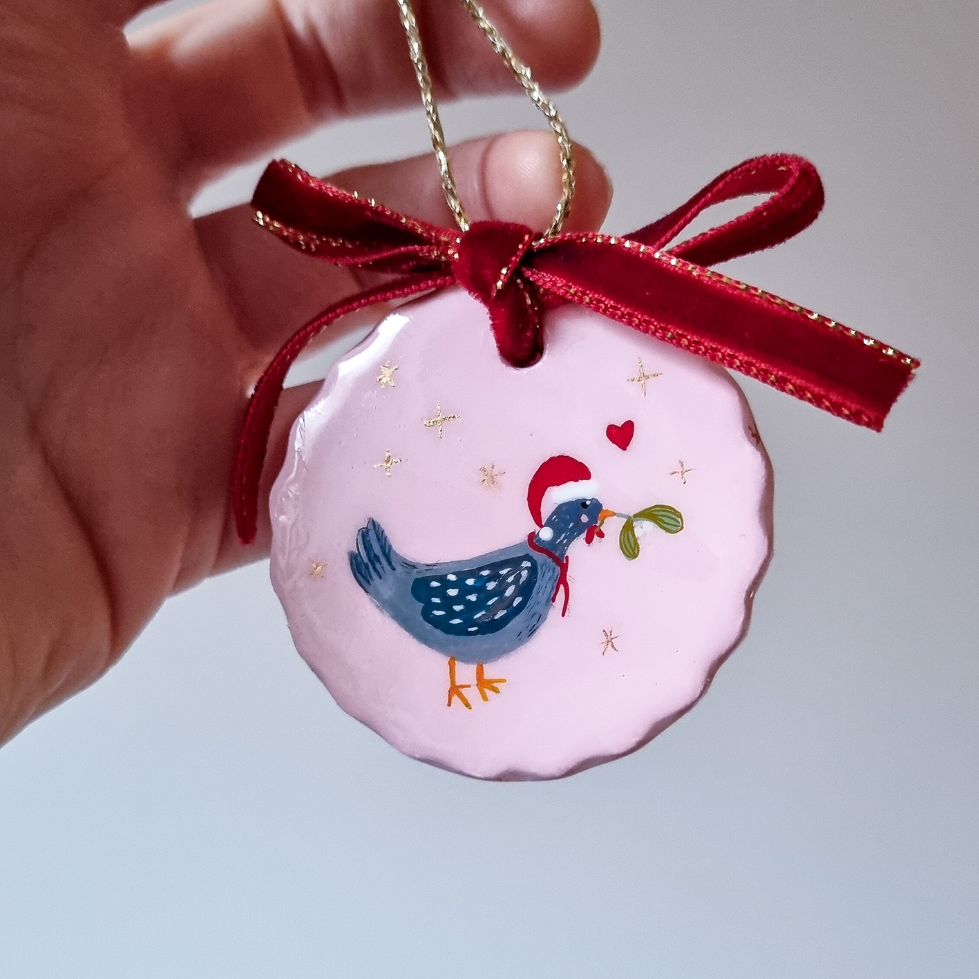 Cette poulette est prête pour fêter Noël ! Avec sa branche de gui coincée dans le bec, elle se rend à la fête de la basse-cour ! Elle est peinte sur un fond rose pastel très doux décoré de petites étoiles dorées.